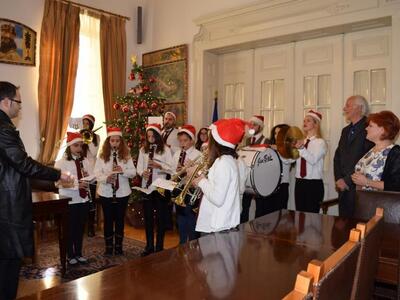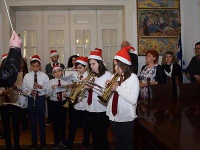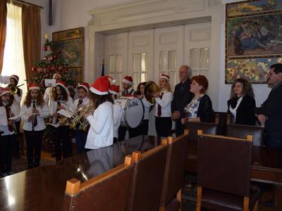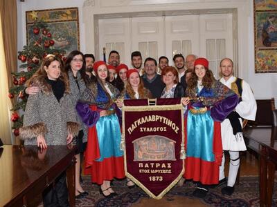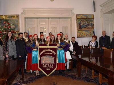 Πρωτοχρονιάτικα κάλαντα και γιορτινή ατμόσφαιρα από το πρωί στο Δημαρχείο. Τα κάλαντα της Πρωτοχρονιάς έψαλαν σήμερα στον Δήμαρχο Πατρέων, Κώστα Πελετίδη, στην Πρόεδρο του Δημοτικού Συμβουλίου και στον Αντιδήμαρχο Διονύση Πλέσσα, η Φιλαρμονική του Ι.Ν. της Αγίας Σοφίας και τα μέλη του Παγκαλαβρυτινού Συλλόγου.