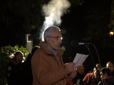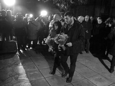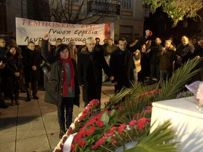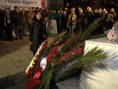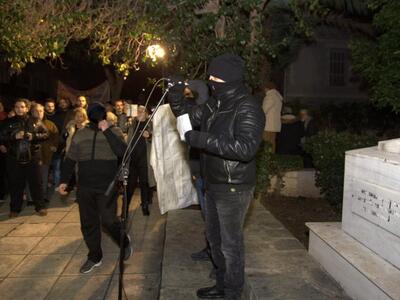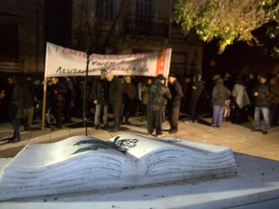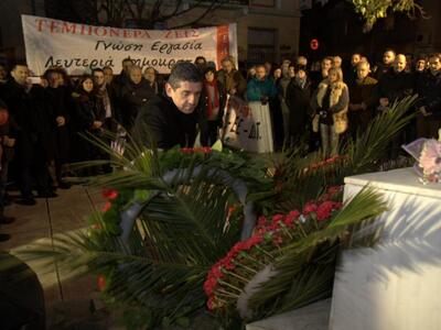 Η παρέμβαση έγινε κατά τη διάρκεια της κατάθεσης στεφάνων στο μνημείο έξω από το σχολικό συγκρότημα Βουδ, όπου δέχθηκε την δολοφονική επίθεση ο καθηγητής Νίκος Τεμπονέρας, πριν από 26 χρόνια.