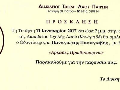 Η εκδήλωση – ομιλία θα γίνει την Τετάρτη 11/1/2017 και ώρα 19.00 το απόγευμα και το θέμα που θα αναπτύξει ο οδοντίατρος και πρώην Δημοτικός σύμβουλος Πατρέων Παναγιώτης Παπαγιαβής, γιος του αειμνήστου πολιτικού Γεωργίου Παπαγιαβή είναι: "Αρκάδες Πρωθυπουργοί".