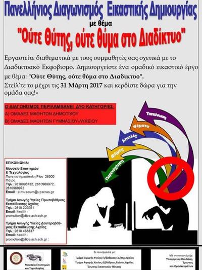 Το Μουσείο Επιστημών και Τεχνολογίας (ΜΕΤ) του Πανεπιστημίου μας, σε συνεργασία με τα Τμήματα Αγωγής Υγείας Πρωτοβάθμιας & Δευτεροβάθμιας Εκπαίδευσης Αχαΐας και την Ένωση Εικαστικών Πάτρας, προκηρύσσει πανελλήνιο διαγωνισμό Εικαστικής Δημιουργίας με θέμα: «Ούτε θύτης, ούτε θύμα στο Διαδίκτυο», με την υποστήριξη / έγκριση του Υπουργείου Παιδείας, Έρευνας και Θρησκευμάτων.
