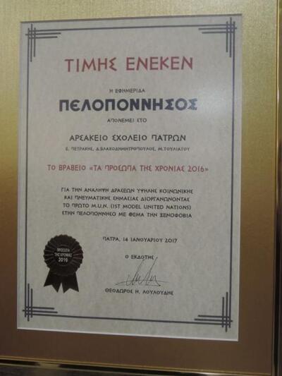Τα Αρσάκεια Σχολεία Πατρών ανεδείχθησαν Σχολεία της χρονιάς για το 2016 στην ετήσια εκδήλωση για τα «Πρόσωπα της Χρονιάς» που διοργάνωσε η εφημερίδα ΠΕΛΟΠΟΝΝΗΣΟΣ στην κατηγορία ΓΡΑΜΜΑΤΑ.