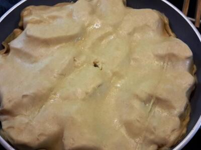 7. Τυλίγουμε το χερούλι του τηγανιού με αλουμινόχαρτο και ψήνουμε σε προθερμασμένο φούρνο στους 190 o C -200 o C για 30’ περίπου, αφού πρώτα έχουμε κάνει μια τρύπα στο κέντρο της πίτας μας για να φεύγει ο ατμός.