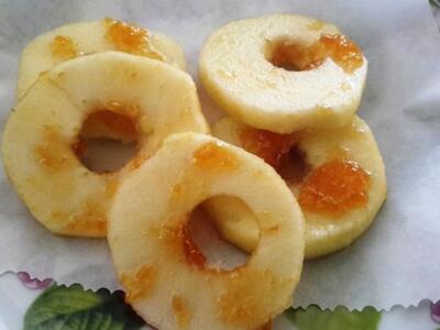 2. Ανακατεύουμε την βανίλια με την μαρμελάδα και αλείφουμε τα μήλα και από τις δύο πλευρές.