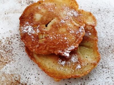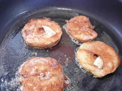5. Βουτάμε τις τηγανίτες στο χυλό και αμέσως μετά στο καυτό λάδι. Χαμηλώνουμε την φωτιά και τηγανίζουμε και από τις δύο πλευρές μέχρι να πάρουν χρυσοκόκκινο χρώμα.