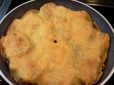 5. Αφαιρούμε το τηγάνι από την φωτιά και αφήνουμε τα μήλα να κρυώσουν για λίγο. Έχουμε ετοιμάσει τη ζύμη και την έχουμε κόψει στρογγυλή 2 εκ. μεγαλύτερη από την διάμετρο του τηγανιού.