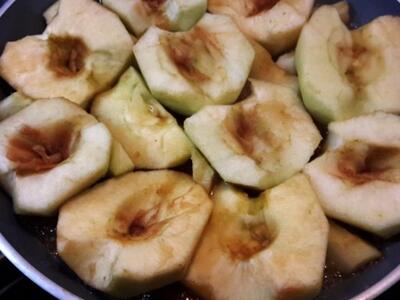 4. Με προσοχή, γιατί η καραμέλα καίει πολύ, τοποθετούμε τα μήλα στο τηγάνι, με την στρογγυλή πλευρά προς τα κάτω. Είναι πολύ σημαντικό να γεμιστούν όλα τα κενά με κομμάτια μήλου. Ξαναβάζουμε το τηγάνι στη φωτιά και καραμελώνουμε για μερικά λεπτά τα μήλα.