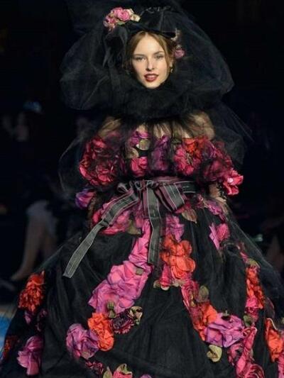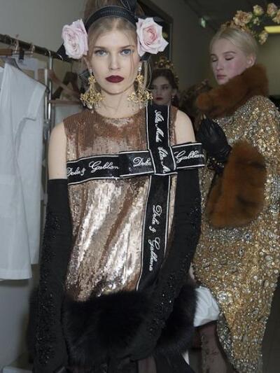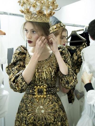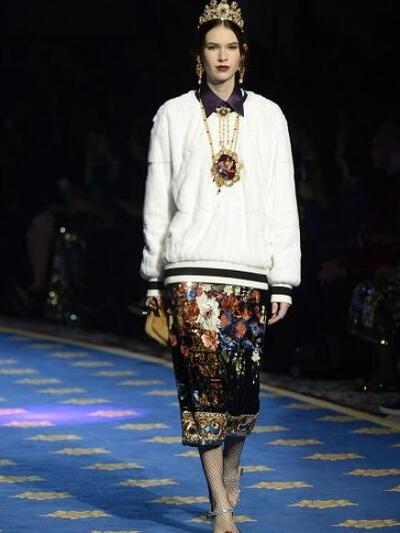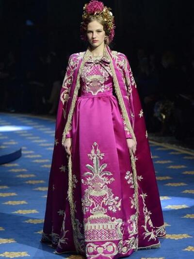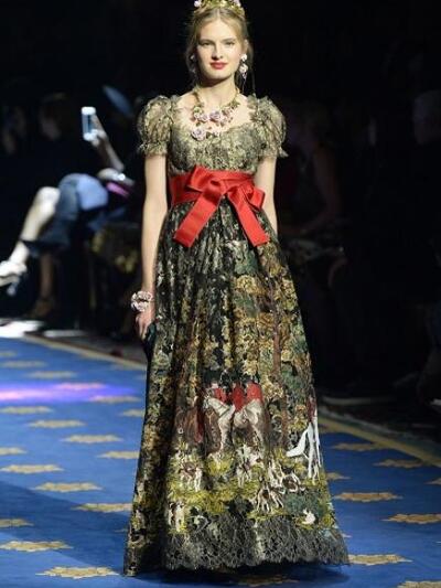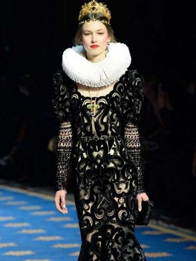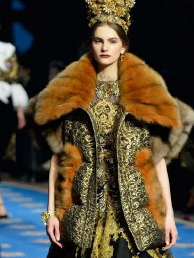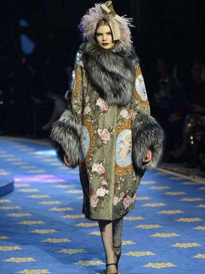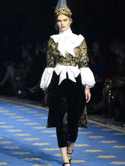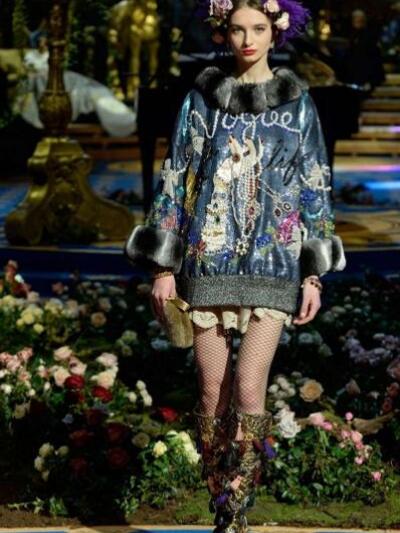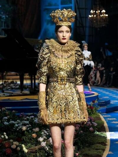 Τα μοντέλα εμφανίστηκαν με ένα μαξιμαλιστικό βεστιάριο με απίστευτες λεπτομέρειες. (Δεν μιλάμε για "φορέσιμες" προτάσεις αλλά για επίδειξη δεξιοτεχνίας). Μεσογειακά μίντι με νοσταλγικά prints, τουαλέτες με μπροκάρ διάκοσμο, παραστάσεις από παλιούς πίνακες, μπολερό με χρυσά ανάγλυφα, παλτά με εικόνες εποχής και πελώρια γούνινα γαρνιρίσματα, μεσαιωνικοί γιακάδες και πριγκιπικά ολοκέντητα μίνι και μάξι. Επίσης, μακριά παραστατικά φούτερ και παντελόνια αρλεκίνου. Το styling εξωπραγματικό. Με στέμματα, τριαντάφυλλα, φτερά, φιόγκους και τα σύμβολα του Μιλάνου στο κεφάλι, κουμπιά και φιόγκους γεμάτους αστραφτερά πετράδια και μπιζού «ασήκωτα» σαν χρυσές καλλιγραφίες. Όπως παρατήρησαν οι ειδήμονες της μόδας, όλα τα ρούχα δεν είχαν καθόλου σέξι και αισθησιακή διάθεση, αφού δεν αποκάλυπταν καθόλου γυμνή επιδερμίδα.
