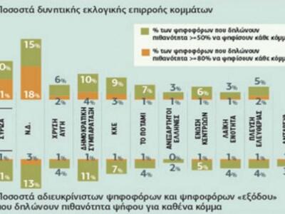 Σε επίπεδο δυνητικής εκλογικής επιρροής ο ΣΥΡΙΖΑ κινείται έως το 21% (18% τον Νοέμβριο), η Ν.Δ. έως το 33% (29%), η Χρυσή Αυγή έως το 8% (10%), η Δημοκρατική Συμπαράταξη έως το 14% (10%), το ΚΚΕ 12% (14%), το ΠΟΤΑΜΙ 8% (8%), οι ΑΝ.ΕΛΛ. 4% (5%), η Ενωση Κεντρώων έως το 7% (8%), η Λαϊκή Ενότητα έως το 4% (3%) και η Πλεύση Ελευθερίας έως το 7% (7%).