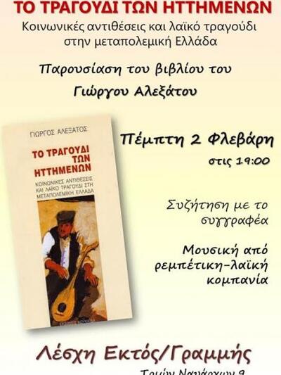 Η λέσχη Εκτός / Γραμμής φιλοξενεί την Πέμπτη 2 Φεβρουαρίου 2017 στις 19.00 τo απόγευμα, τη βιβλιοπαρουσίαση του έργου του Γιώργου Αλεξάτου με τίτλο "Το τραγούδι των ηττημένων, Κοινωνικές αντιθέσεις και λαϊκό τραγούδι στη μεταπολεμική Ελλάδα".