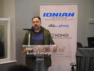 Στην εκδήλωση παραβρέθηκε και ο Γιώργος Σιμόπουλος Διευθύνων Σύμβουλος του τηλεοπτικού Σταθμού Σταρ Κεντρικής Ελλάδας και Γραμματέας Γενικός Γραμματέας της Ένωσης Ενημερωτικών Τηλεοράσεων Ελληνικής Περιφέρειας. Ο κ. Σιμόπουλος, τόνισε ότι το ΙΟΝΙΑΝ είναι από τους λίγους τηλεοπτικούς σταθμούς που επιμένουν στην ποιότητα, ενώ έκανε εκτενή αναφορά στο ζήτημα της δικτύωσης. “ Δικτύωση σημαίνει να γίνεται ένα μέσο δυνατό, χωρίς όμως να αλλοιώνεται η ταυτότητά του. Ο κάθε σταθμος, πρέπει να υπηρετεί την Περιφέρειά του. Έχει υποχρέωσει να το κάνει απέναντι στους Πολίτες. Εμείς εκπέμπουμε από τα Άγραφα μέχρι τα όρια της Αττικής. Δεν περιμένουμε να πάρουμε διαφήμιση από τα Άγραφα, έχουμε όμως υποχρέωση απέναντι στους πολίτες της περιοχής αυτής, να τους ενημερώνουμε και το κάνουμε. Όπως έχουμε επιλέξει τα 4 τελευταία χρόνια να δείχνουμε το Πατρινό Καρναβάλι μέσω του ΙΟΝΙΑΝ, γιατί ο κόσμος το αγαπάει”, σημείωσε ο κ. Σιμόπουλος.