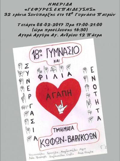 Το 18ο Γυμνάσιο Πάτρας με Ειδικά Τμήματα και Λυκειακές Τάξεις Κωφών/βαρήκοων σε συνεργασία με τον Σχολικό Σύμβουλο Ειδικής Αγωγής & Εκπαίδευσης 5ης Περιφέρειας, κ. Ρισβά Αθανάσιο και τη Σχολική Σύμβουλο ΠΕ15 και Υπεύθυνη Παιδαγωγικής Καθοδήγησης του Σχολείου, Ευαγγελία Κροκίδη διοργανώνει Ημερίδα με τίτλο: «Γέφυρες Εκπαίδευσης» 32 χρόνια Συνύπαρξης στο 18ο Γυμνάσιο Πάτρας, την Τετάρτη, 8 Φεβρουαρίου 2017, 17:00-21:00 στην Αγορά Αργύρη (Αγ. Ανδρέου 12), Πάτρα