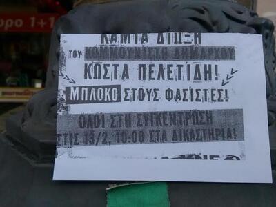17.18: Για τις 23 Φεβρουαρίου διακόπηκε η δίκη του δημάρχου Πατρέων Κώστα Πελετίδη μετά από τη μήνυση της Χρυσής Αυγής. Οι συγκεντρωμένοι μετά από την ανακοίνωση της απόφασης του δικαστηρίου, έφυγαν από την οδό Γούναρη και η κυκλοφορία των οχημάτων διεξάγεται κανονικά.