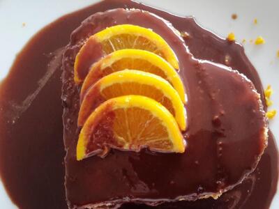 Σκεπάζουμε με το τρίτο παντεσπάνι, ρίχνουμε την σος σοκολάτας σιγά σιγά για να απορροφάται και όταν τελειώσουμε στολίζουμε από πάνω με φέτες πορτοκαλιού και ξύσμα από πορτοκάλι.