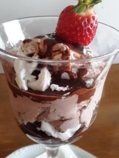 Σπάμε τις μαρέγκες σε κομμάτια και βάζουμε το ¼ σε κάθε ποτήρι, συνεχίζουμε με μια στρώση σαντιγί, μία στρώση σπασμένες μαρέγκες και τέλος με την σος σοκολάτας.
