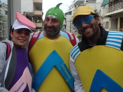 Την εκκίνηση έκαναν χαρούμενοι τιρκουάζ δεινόσαυροι και λαγοί, άλλοι ασπρόμαυροι και άλλοι γαλάζιοι με φούξια. Ακολουθούσαν ριγωτοί μεξικάνοι, κίτρινα κοτόπουλα, πολύ χαριτωμένοι φούξια- μαύροι πιερότοι. Κάποια πολύχρωμα σκιάχτρα μας γοήτευσαν με τις κατασκευές τρακτεράκια τους ενώ χειροκροτήσαμε θερμά τα progressive φούξια σταφύλια. Μας άρεσαν ακόμα μεταξύ άλλων: ταξιδιώτες με βαλίτσες χειροτεχνίας, σκάκι, αγροτόσπιτο με χωρικούς, πορτοκάλια με κουρδιστά καπελάκια, ουράνια τόξα, λευκοί και μαύροι κύκνοι, χιονάνθρωποι αλλά και οι κεφάτες σαγιονάρες.