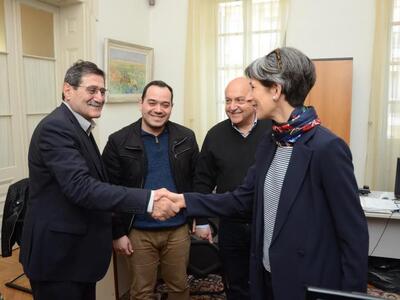 Η Πρέσβης ξεναγήθηκε στους χώρους του Δημαρχείου κι έδειξε ιδιαίτερο ενδιαφέρον για τα έργα του Πατρινού ζωγράφου Επαμεινώνδα Θωμόπουλου.