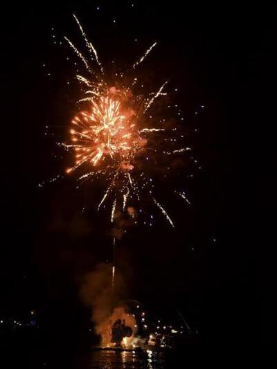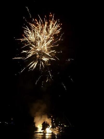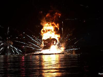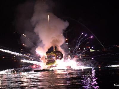Ο Καρνάβαλος παραδίδεται στην πυρά με ένα φαντασμαγορικό τρόπο στη θάλασσα και σε συνδυασμό με την καταιγιστική ρίψη των πυροτεχνημάτων που έκαναν τη νύχτα μέρα για μεγάλο χρονικό διάστημα.