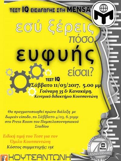Στη συνέχεια, η Ελληνική MENSA θα πραγματοποιήσει τα επίσημα τεστ I.Q. στο κεντρικό διδακτήριο των Φροντιστηρίων Κουτσαντώνη, Γούναρη 35 και Κανακάρη, το Σάββατο 11 Μαρτίου και ώρα 17:00.