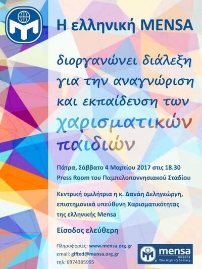 Μια εξαιρετικά ενδιαφέρουσα διάλεξη, για γονείς και εκπαιδευτικούς, διοργανώνει στην Πάτρα η Ελληνική MENSA, το Σάββατο 4 Μαρτίου και ώρα 18:30, στο Press Room του Παμπελοποννησιακού Σταδίου. Θ΄ αναλυθεί σε όλες τις πτυχές το μείζον θέμα της αναγνώρισης και εκπαίδευσης των Χαρισματικών παιδιών.