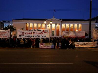 Σε εξέλιξη βρίσκεται πορεία διαμαρτυρίας προς τη Βουλή από μέλη αριστερών, συνδικαλιστικών, αντιεξουσιαστικών και αντιφασιστικών συλλογικοτήτων, που αντιτίθενται στην πολιτική της κυβέρνησης.