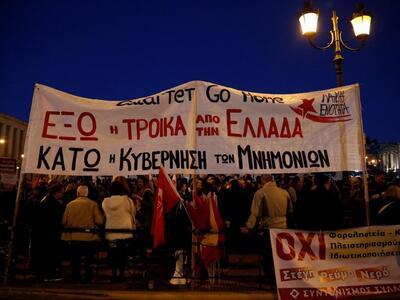 Πίσω από το κεντρικό πανό της Πρωτοβουλίας Πρωτοβάθμιων Σωματείων, όπου αναφέρεται, μεταξύ άλλων, "όχι στο νέο μνημόνιο, όχι στις ιδιωτικοποιήσεις, όχι στην ανεργία, ναι στις συλλογικές συμβάσεις", ακολουθούν η Λαϊκή Ενότητα, η ΑΝΤΑΡΣΥΑ, το ΕΕΚ, η ΠΕΝΕΝ, η Ροσινάντε, η ΟΡΜΑ, η Ταξική Πάλη κ.α.