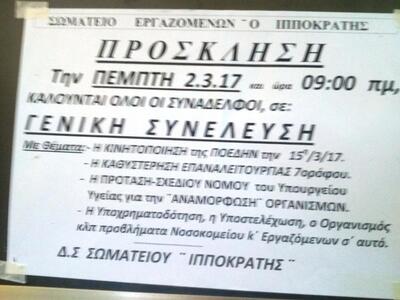 Όπως φαίνεται και στην ανακοίνωση που είχαν αναρτήσει οι συνδικαλιστές στους χώρους του Αγ. Ανδρέα αλλά και του 409 κ.α. ζητούσαν από τους εργαζομένους να προσέλθουν στην Γ.Σ. που είχε οριστεί για τις 9:00 το πρωί της Πέμπτης 2 Φεβρουαρίου. Ένα από τα βασικά προς συζήτηση θέματα ήταν και «η καθυστέρηση επαναλειτουργίας του 7ορόφου», όμως ο κ. Σερεμέτης είχε άλλα σχέδια.