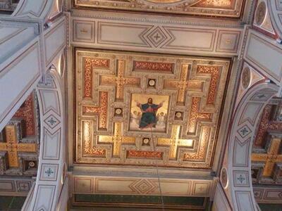Τό σχέδιο τῆς ὀροφῆς τοῦ Ναοῦ ἐκπόνησε ὁ περίφημος Γερμανός ἀρχιτέκτονας Τσίλλερ. Στο ἀρχεῖο τοῦ Ναοῦ σώζονται τά σχέδια τοῦ Τσίλλερ. Σύνολη ἡ περισπούδαστη αὐτή ὀροφή κατασκευάστηκε μέ ξυλεία ἀπό τήν Τεργέστη καί τήν Βενετία καί διακοσμήθηκε ἀπό τούς κοσμηματογράφους Κόλλα, Πέττα καί ἄλλους. Ἡ ὀροφή αὐτή δικαίως χαρακτηρίζεται ἀριστουργηματική, μέ γραμμικά σχέδια, δουλεμένα σέ ξύλο μέ ἀκρίβεια καί χάρη. Τά χρώματα πού κυριαρχοῦν εἶναι τό χρυσό καί τό πορφυρό. Ὁ ἄνθινος διάκοσμος πλαισιώνει τίς τετράγωνες καί παραλληλόγραμμες εἰκόνες καθώς καί τήν κυκλική εἰκόνα τοῦ Θεοῦ Πατρός.