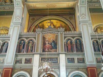 Ὁ κυρίως Ναός στολίζεται μέ δώδεκα τοιχογραφίες, οἱ ὁποῖες εἶναι μικροῦ σχετικά μεγέθους καί ἐπίσης μέ ὁκτώ μεγάλων διαστάσεων πίνακες “ἐλαιογραφίες”, τοποθετημένους σέ βαριές σκαλιστές περίτεχνες κορνίζες καί ἱστορημένους ἀπό τό 1853 ἕως καί τό 1907. Ἀρκετές ἀπό τίς εἰκόνες εἶναι ὄχι ἁπλῶς δυτικότροπα, ἀλλά δυτικά ἀντίγραφα.
