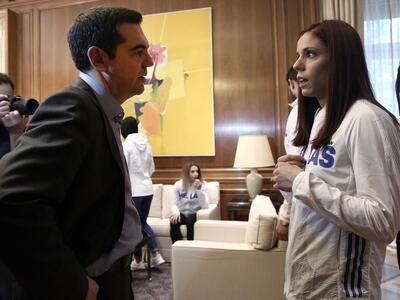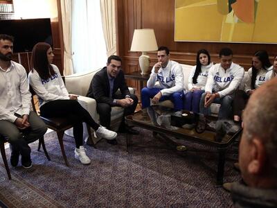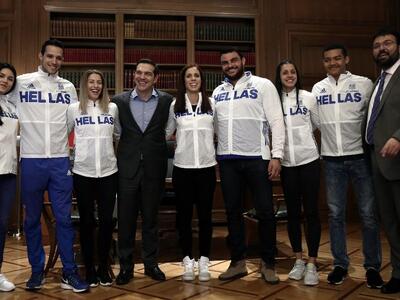 Τους αθλητές της εθνικής αποστολής που συμμετείχαν και διακρίθηκαν στο 34ο Ευρωπαϊκό Πρωτάθλημα Κλειστού Στίβου, συνοδευόμενους από τον υφυπουργό Αθλητισμού, Γιώργο Βασιλειάδη, τον Πρόεδρο του ΣΕΓΑΣ, Κώστα Παναγόπουλο, τον Εθνικό Προπονητή Γιάννη Κουτσιώρα και τους προπονητές τους, υποδέχθηκε στο Μέγαρο Μαξίμου ο Πρωθυπουργός, Αλέξης Τσίπρας.