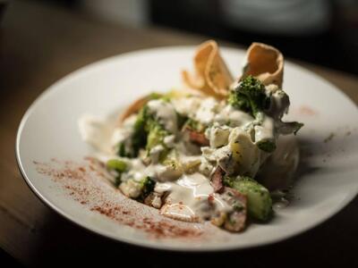 Ζεστή σαλατα σε φωλιά αραβικής με μπρόκολο, πατάτα και σως μαγιονέζας. Από τα all time favourites!