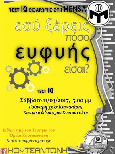 Η Ελληνική MENSA θα πραγματοποιήσει τα επίσημα τεστ I.Q. στο κεντρικό διδακτήριο των Φροντιστηρίων Κουτσαντώνη, Γούναρη 35 και Κανακάρη, το Σάββατο 11 Μαρτίου και ώρα 17:00.