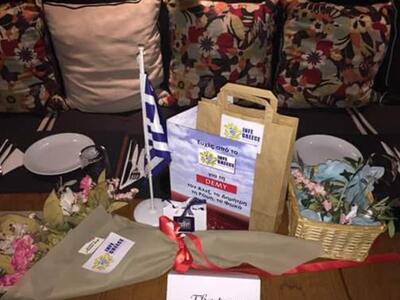 Tο διοικητικό συμβούλιο του σωματείου προσέφερε στη φετινή μας εκπρόσωπο -όπως κάνει κάθε χρόνο- τα καθιερωμένα "γούρια" του καθώς και τα δώρα που θα τη συντροφεύσουν στο Κίεβο της Ουκρανίας ενώ σημειολογικής σημασίας θα μπορούσε να χαρακτηρισθεί ο κλάδος ελιάς, η Ελληνική σημαία αλλά και τα ντόπια εδέσματα που προσφέρθηκαν στην καλλιτέχνιδα και την ομάδα του Infe Greece και τον σεφ του μαγαζιού.