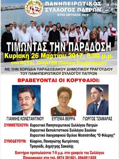 Με τίτλο «Τιμώντας την Παράδοση» η Πανηπειρωτικός σύλλογος της Πάτρας διοργανώνει την Κυριακή 26 Μαρτίου 2017 μία μουσική βραδιά στο Royal – παλιό Πτωχοκομείο στην Ακτή Δυμαίων όπου θα συμμετάσχει η Χορωδία παραδοσιακού δημοτικού τραγουδιού του Συλλόγου ενώ θα τιμηθούν κορυφαίοι καλλιτέχνες του είδους όπως η Ευγενία Βέρρα και ο Γιάννης Κωνσταντίνου.