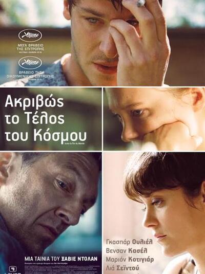 To φιλμ «Ακριβώς το τέλος του κόσμου - Juste la fin du monde» σε σκηνοθεσία του Καναδού Ξαβιέ Ντολάν με τους Γκασπάρ Ουλιέλ, Νάταλι Μπέι, Μαριόν Κοτιγιάρ, Βενσάν Κασέλ & τη Λέα Σεϊντού, θα βγει στις ελληνικές αίθουσες την Πέμπτη 23 Μαρτίου 2017 και είναι πιθανό να το δούμε και στην Πάτρα.