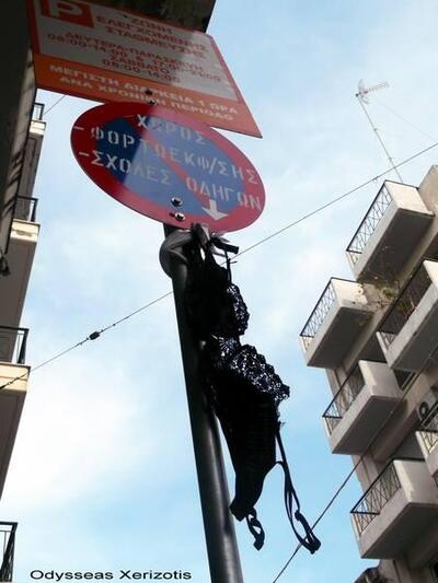 Ένα μαύρο σουτιέν κρέμασαν άγνωστοι σε πινακίδα χώρου φορτοεκφόρτωσης και Σχολής Οδηγών στο κέντρο της Πάτρας. Το απίστευτο περιστατικό κατέγραψε με τον φωτογραφικό του φακό ο γνωστός συμπολίτης Οδυσσέας Ξεριζωτής ο οποίος μάλιστα την ανέβασε στο facebook σημειώνοντας με περιπαικτική διάθεση: