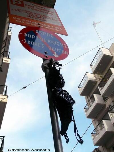 Ένα... μαύρο σουτιέν κρεμασμένο στην πινακίδα που απαγορεύει τη στάθμευση στο σημείο...