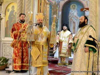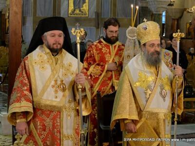 "Ὁ Σεβασμιώτατος Μητροπολίτης Πατρῶν κ.κ. Χρυσόστομος τὴν Κυριακὴ 19.3.2017, ἐτέλεσε τὴν Θεία Λειτουργία στὸν Νέο Ἱερὸ Ναὸ τοῦ Ἁγίου Ἀποστόλου Ἀνδρέου Πατρῶν, συλλειτουργοῦντος τοῦ Θεοφιλεστάτου Ἐπισκόπου Σάχτε (Πατριαρχεῖο Ρωσίας) κ. Σίμωνος, ὁ ὁποῖος εὑρέθη κατ’ αὐτάς, στὴν Πάτρα γιὰ προσκυνηματικοὺς λόγους.