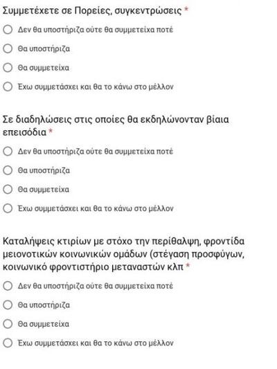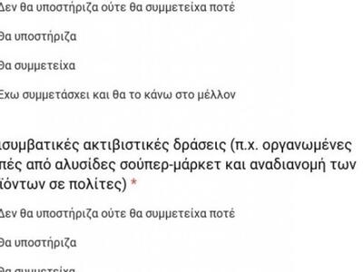 Οι συμμετέχοντες καλούνται να απαντήσουν, μεταξύ άλλων, αν θα συμμετείχαν σε κλοπές από σούπερ μάρκετ για να αναδιανείμουν τα προϊόντα σε πολίτες (το οποίο αποκαλείται στο ερωτηματολόγιο «αντισυμβατική ακτιβιστική δράση»), σε καταλήψεις (γραφείων κομμάτων, πολιτικών και τραπεζών), σε βίαια επεισόδια κ.α.