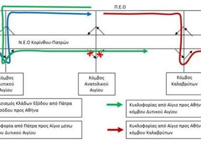 Η κυκλοφορία της Νέας Εθνικής Οδού από Πάτρα προς Αίγιο θα εξυπηρετείται από τον Κόμβο Δυτικού Αιγίου και η κυκλοφορία από Αίγιο προς Αθήνα θα διεξάγεται μέσω της ΠΕΟ και θα εισέρχεται στη ΝΕΟ Κορίνθου – Πατρών είτε μέσω του κόμβου Δυτικού Αιγίου είτε μέσω του κόμβου Καλαβρύτων, όπως φαίνεται στο ακόλουθο σχηματικό διάγραμμα.