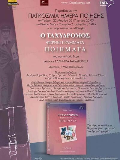 Τα Ελληνικά Ταχυδρομεία, η Εταιρεία Συγγραφέων, το ηλεκτρονικό λογοτεχνικό περιοδικό www.diapolitismos.net και το Γραφείον ποιήσεως συνεορτάζουν την Παγκόσμια Ημέρα Ποίησης στις 22 Μαρτίου 2017, στο θέατρο Μπάρι (Σανταρόζα 7 και Καρόλου) στην Πάτρα στις 20:00 μμ, με μια μεγάλη εκδήλωση βασισμένη στην ανθολογία του ποιητή Ηλία Γκρή «Ο ΤΑΧΥΔΡΟΜΟΣ ΦΕΡΝΕΙ ΓΡΑΜΜΑΤΑ ΠΟΙΗΜΑΤΑ».