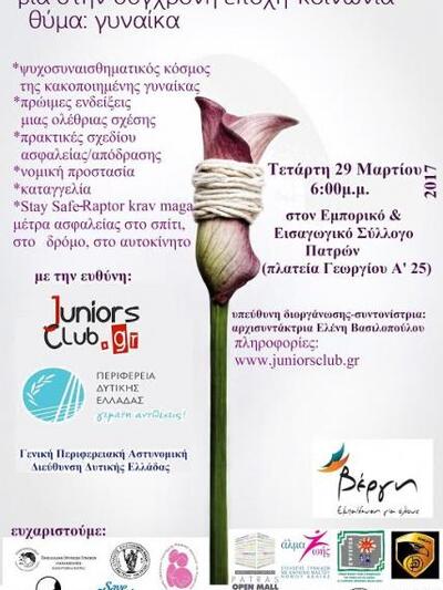 Εκδήλωση με θέμα «Βία στην σύγχρονη εποχή-κοινωνία» με επίκεντρο τη γυναίκα-θύμα της ψυχολογικής, λεκτικής, σωματικής βίας και σεξουαλικής παρενόχλησης-κακοποίησης, θα διεξαχθεί την Τετάρτη 29 Μαρτίου 2017 στις 18.00 το απόγευμα, στον Εμπορικό & Εισαγωγικό Σύλλογο Πάτρας (Πλατεία Γεωργίου Α΄25).