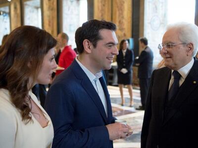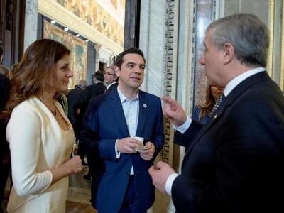 Στο πλευρό του Αλέξη Τσίπρα ήταν η σύντροφός του Περιστέρα Μπαζιάνα, στην εκδήλωση που έγινε στο Καπιτώλιο, όπου πριν από 60 χρόνια υπογράφηκε η Συνθήκη της Ρώμης. Η Περιστέρα Μπαζιάνα φόρεσε ένα κομψό λευκό ταγιέρ και μαύρες γόβες, ενώ είχε αφήσει κάτω τα μαλλιά της.