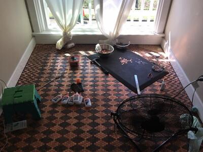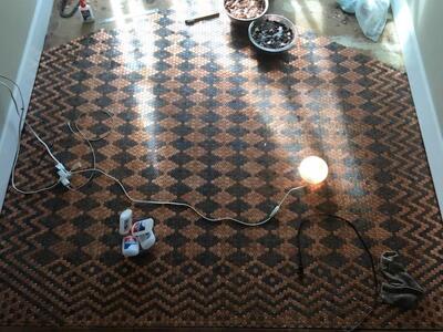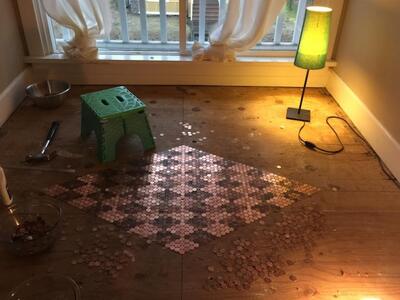 Στρώθηκε στη δουλειά. «Ξεκίνησα με το να μετρήσω το εμβαδόν, να βρω το κέντρο» αφηγήθηκε. Στη συνέχεια, χάραξε έναν άξονα, ως οδηγό. Άρχισε να τοποθετεί τα κέρματα χωρίς να έχει κατά νου ένα συγκεκριμένο διακοσμητικό σχέδιο, εναλλάσσοντας την πλευρά (άλλα, «κορώνα», άλλα, «γράμματα», για οπτική αντίθεση): «Ξεκίνησα με ρόμβους, μου άρεσε αυτό που είδα, και συνέχισα» είπε στο Bored Panda. Σε διάστημα λίγων μηνών, το όραμά της ήταν πραγματικότητα. Την καθυστέρησε το ένα από τα σκυλάκια της -ακούει στο όνομα «Μπελάς»- που έκανε συχνά τα κακάκια του πάνω στα κέρματα.