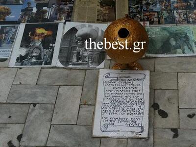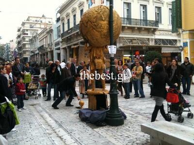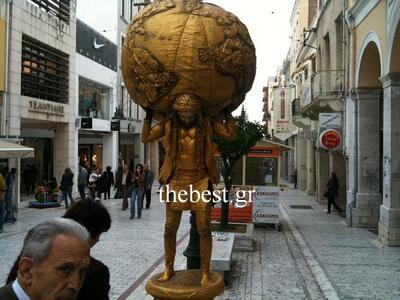 Πρωί Παρασκευης στην Αγίου Νικολάου. Ο κόσμος χαζεύει τον Έλληνα κατά δήλωση του καλλιτέχνη, που βαμμένος με χρυσαφένιο χρώμα αναπαριστά τον Άτλαντα, που σηκώνει την Γη. Ακίνητος και σχεδόν ανέκφραστος, συγκεντρώνει τα βλέμματα των περαστικών, ενώ στην βάση του βάθρου πάνω στο οποίο στέκεται ακίνητος επί ώρες, υπάρχουν σαν σε πάπυρο πληροφορίες για την…καλλιτεχνική του πορεία!