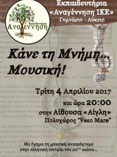 Το Γυμνάσιο και το Λύκειο των Εκπαιδευτηρίων «Αναγέννηση» διοργανώνουν για δεύτερη φορά την εκδήλωση με τον τίτλο «Κάνε τη Μνήμη … Μουσική». Η εκδήλωση θα πραγματοποιηθεί την Τρίτη 04/04/2017 στις 20:00, στην Αίθουσα «Αίγλη» (Πολυχώρος “Veso Mare”).