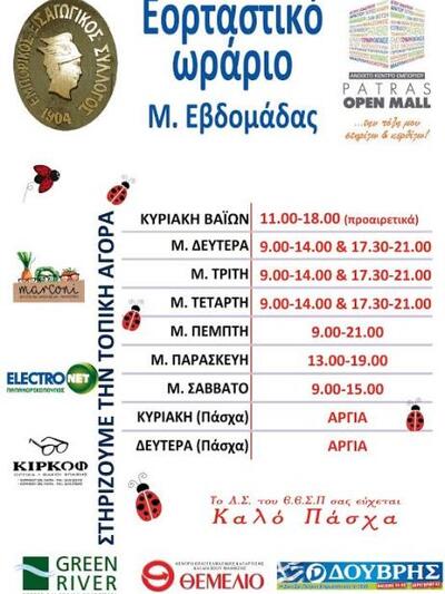 «Το εορταστικό ωράριο που προτείνεται να ακολουθήσουν τα Εμπορικά Καταστήματα για την Μεγάλη Εβδομάδα είναι το εξής: