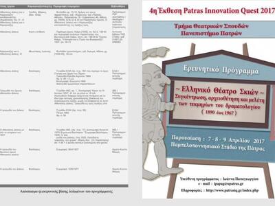 «Κατά τη διάρκεια του τριημέρου 7 έως 9 Απριλίου έκθεση του Ερευνητικού Προγράμματος "Ελληνικό Θέατρο Σκιών" - "Συγκέντρωση, αρχειοθέτηση και μελέτη των τεκμηρίων του δραματολογίου (1890-1967)" που θα λάβει χώρα στο Παμπελοποννησιακό Στάδιο (Περίπτερο αρ. 77) στο πλαίσιο της 4ης Έκθεσης Patras Innovation Quest 2017.»