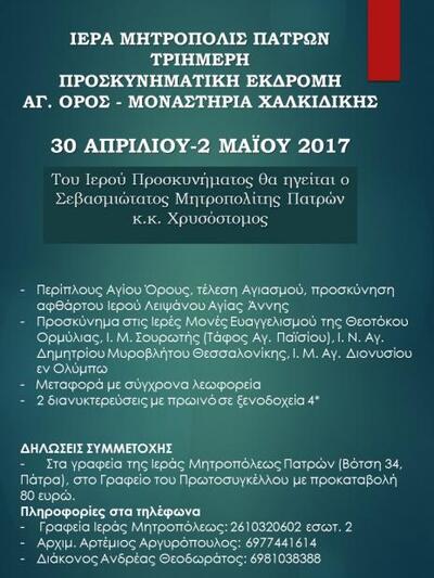 Τριήμερη προσκυνηματική εκδρομή διοργανώνει η Ιερά Μητρόπολη Πατρών στο Άγιον Όρος και σε μοναστήρια της Χαλκιδικής.