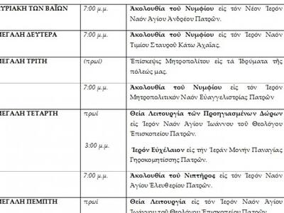 Την Μεγάλη Δευτέρα 10/4 στις 19.00 ο κ. Χρυσόστομος θα τελέσει την ακολουθία στον ιερό ναό Τιμίου Σταυρού στην Κάτω Αχαΐα ενώ την Μ. Τρίτη 11/4 θα επισκεφθεί το πρωί ιδρύματα της πόλης μεταφέροντας Πασχαλινές ευχές και δώρα ενώ για την ακολουθία το απόγευμα στις 19.00 όπου θα ακουστεί το τροπάριο της Κασσιανής μοναχής ο σεβασμιότατος Μητροπολίτης κ. Χρυσόστομος θα βρίσκεται στον ιερό Μητροπολιτικό ναό της Ευαγγελίστριας.