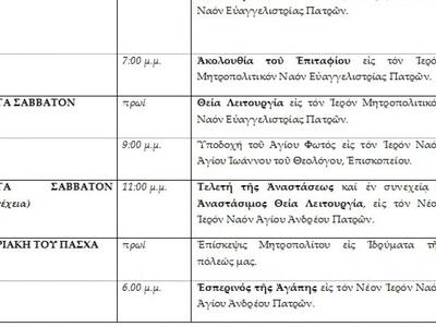 Για την Μεγάλη Τετάρτη 12/4 το πρωί ο κ. Χρυσόστομος θα τελέσει την Θεία λειτουργία των προηγιασμένων δώρων στο παρεκκλήσι του Αγίου Ιωάννου του Θεολόγου, για το ιερό ευχέλαιο στις 15.00 θα μεταβεί στην ιερά μονή Γηροκομείου και το βράδυ για την ακολουθία του Νιπτήρος στον ιερό ναό Αγ. Ελευθερίου Πατρών.